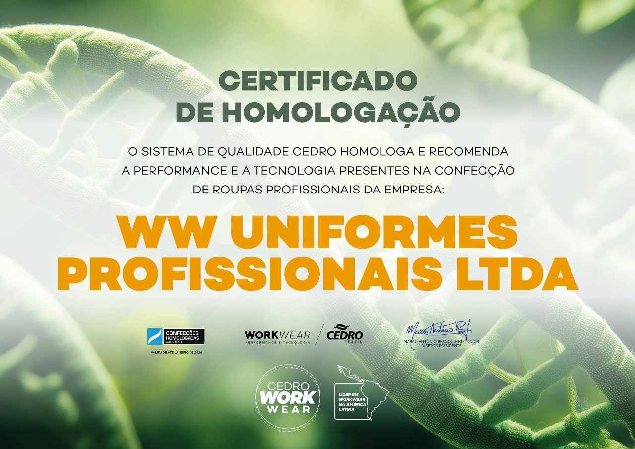 O sistema de qualidade CEDRO homologa e recomenda a performance e a tecnologia presentes na confecção de roupas profissionais da empresa: WW Uniformes Profissionais LTDA